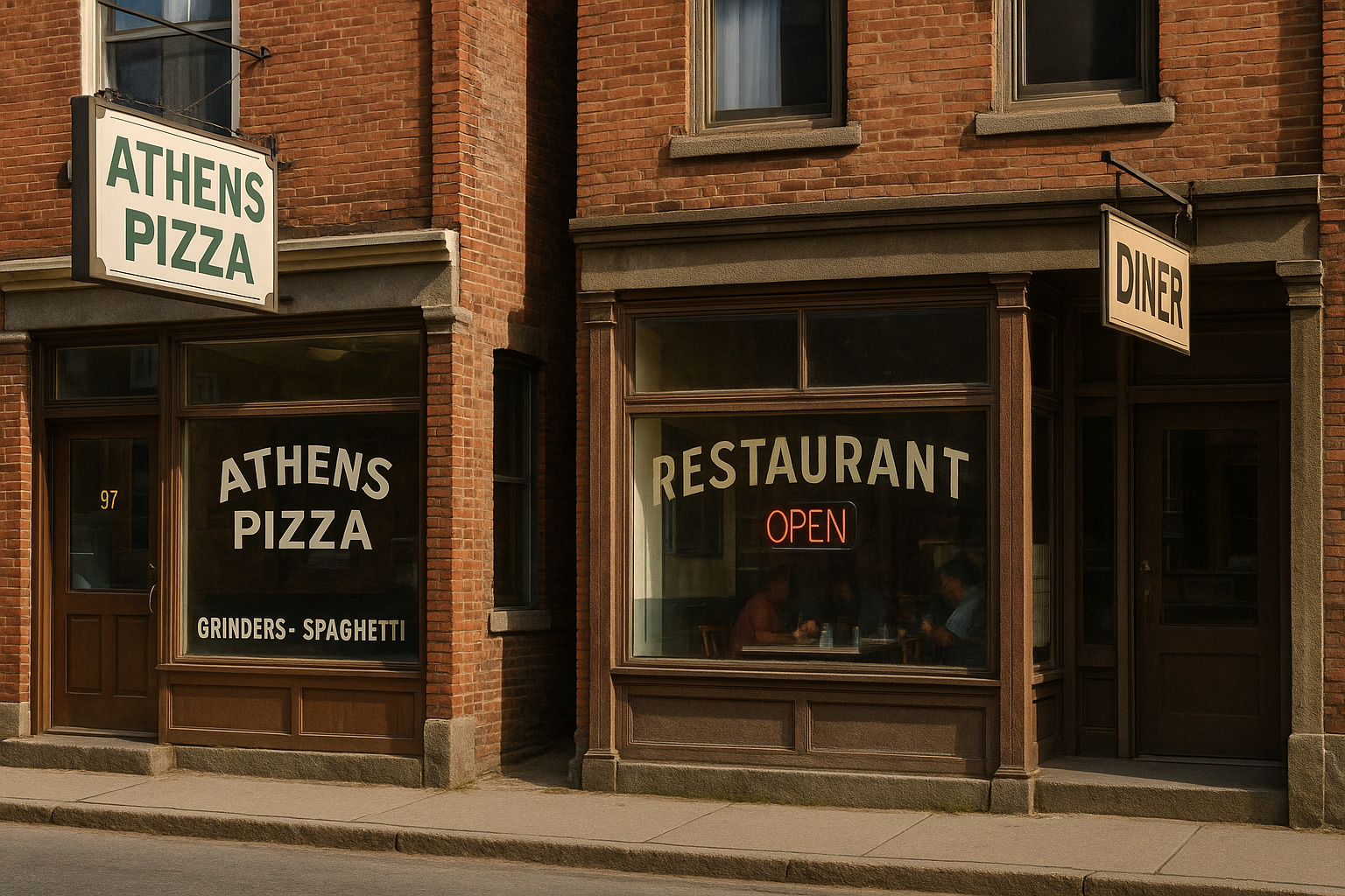 Athens Pizza sits at the emotional and cultural center of Atkinson Street in Bellows Falls. Since the early 1980s, this family-owned restaurant has been a steady presence in town life. Started by a Greek family who made southern Vermont their home, Athens Pizza quickly became more than a place to eat. It became a meeting point for generations. High school students celebrate wins here. Families gather after long workdays. Travelers stop in on impulse and leave with a sense of belonging. The smell of fresh dough, bubbling cheese, and oregano now feels like part of the town’s identity itself.