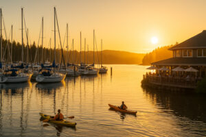 Mornings are ideal for hiking before the sun climbs, afternoons for kayaking or paddleboarding across calm water. In the evenings, the Fireside Restaurant and marina cafés buzz softly with conversation as the horizon melts into gold.
