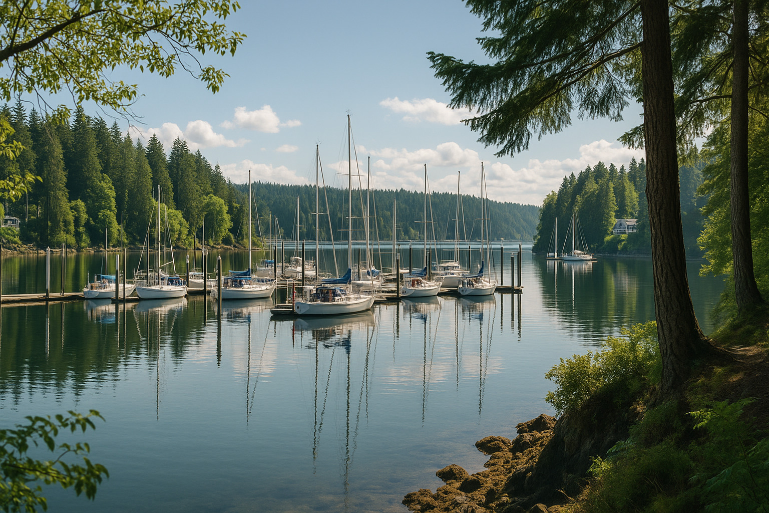 The Port Ludlow Marina and Harbor Vista Deck form the most accessible and rewarding starting point for photographers. From sunrise to mid-morning, you can frame herons on pilings, geometric rows of masts, and glassy reflections that double the sky. Later, blue hour turns dock lights into a constellation on the water. Tripods on the outer deck, polarizing filters to tame glare, and occasional long exposures on windless days turn everyday marina scenes into images where boats seem to float above liquid glass, especially when revisited again at dusk.
