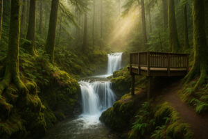 The sound of the waterfall is softer than thunder but constant enough to fill the air. Morning mist catches sunlight in tiny rainbows, and moss-coated trunks frame the view like a living cathedral.